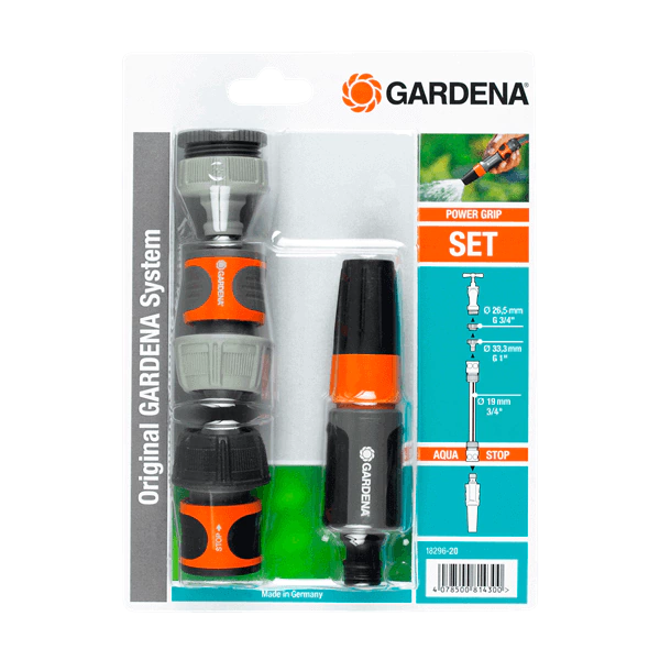 Kit completo de riego para una conexión rápida de grifo y manguera. Con este kit, tiene todos los accesorios del Sistema Original GARDENA y una lanza de limpieza listos para usar con su manguera. Incluye: Un reductor de 1" a 3/4" (1 x 0530520), un conector de canilla de 1" (1 x 1820220), un conector de manguera de 3/4" (1 x 1821620), un conector de manguera stop de 3/4" (1 x 1821420) y una lanza multichorro Classic (1 x 1830020).