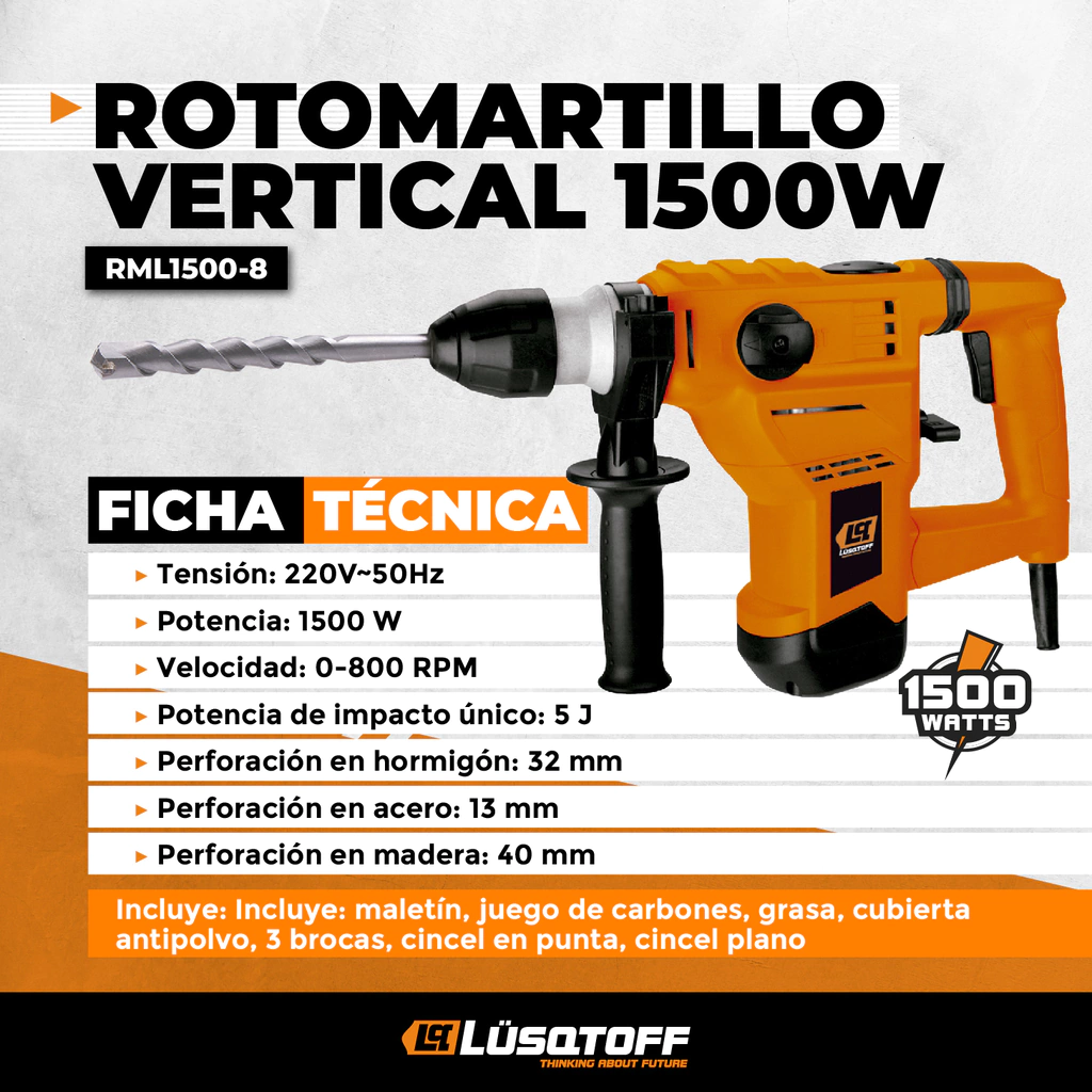 - Incluye maletín, embrague de seguridad antibloqueo, selector de posición de cincel y mandril con adaptador para perforar madera y metal.